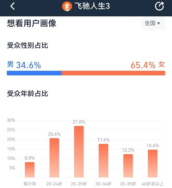 《飞驰人生3》淘票票累计想看用户中占比最高的是20-24岁、25-29岁、30-34岁,占比分别为20.6%、27%、17.6%,就做到了以核心受众为主。