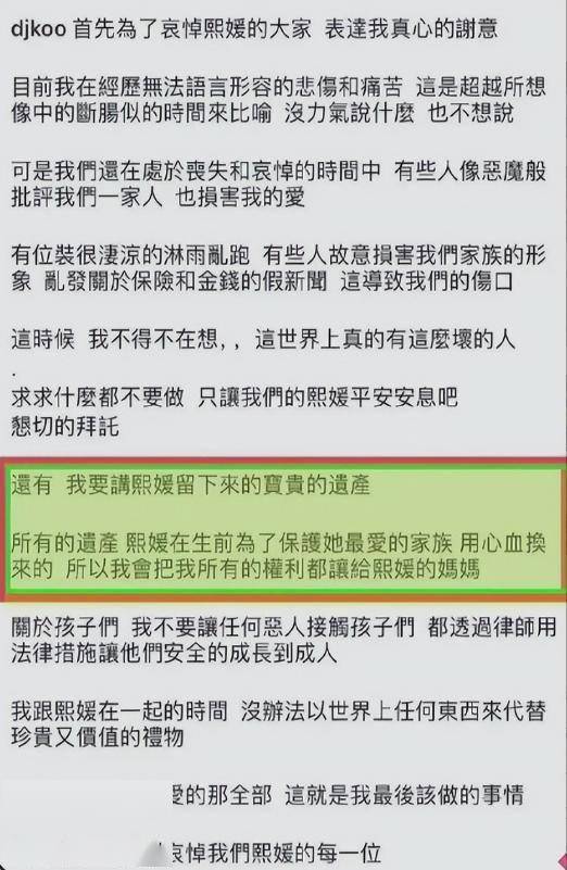 自己将放弃大S遗产的三分之一份额,约2亿新台币的资产,全部留给两个未成年孩子。