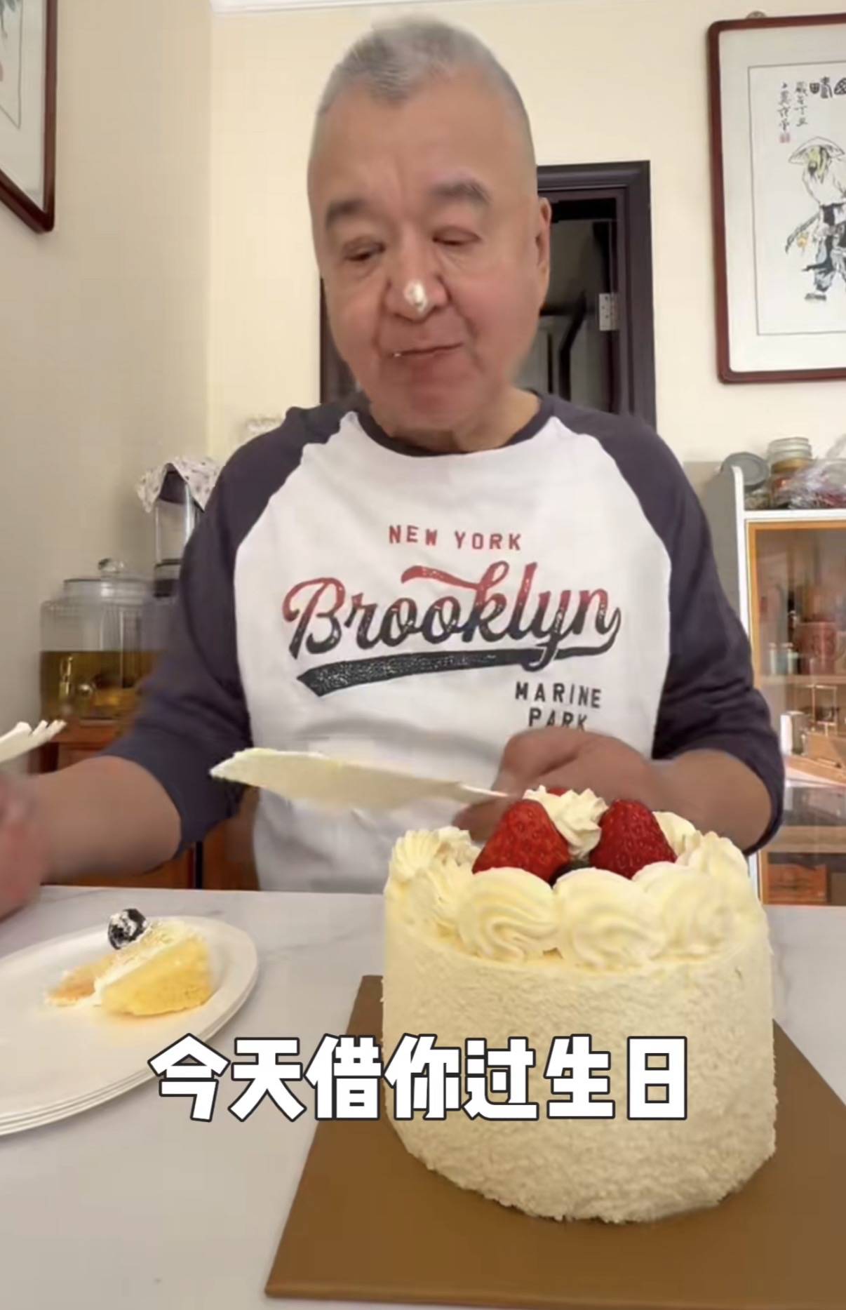 高云翔不仅给父亲准备了长寿面,还买了一个小小的生日蛋糕,把奶油抹在父亲鼻子上。虽然只有父子两个人,但是氛围很欢乐。