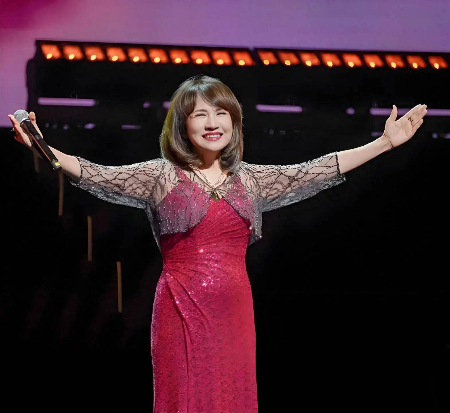 舞台上的郑绪岚头发染成了深褐色,身着红色长裙,配镂空上衣,身材并不臃肿。虽然她已经67岁了,但嗓音依然是那么甜美圆润,高音区游刃有余。