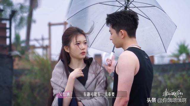 从一开始就被锁定的恩达和冠冠,我始终看不透他们之间的感情走向。恩达对小杨似乎有些好感,但说完全没有演技成分,我可不信。特别是小杨在台上唱歌时,恩达眼里闪烁着泪光,仿佛第一次听到情歌一般,情绪的波动如此剧烈。难道他是怕小杨的高音唱破音,才这样感动吗? 至于冠冠,始终处于一种相对被动的状态。他似乎被妍妍架到那个位置上,被迫做出反应,却没有太多主动的表达。如果他的职业是健身教练,那一切都能解释得通。他对妍妍的态度,像个健身教练对待会员一样,既不主动,也不拒绝。你靠近他,他能接受,但总带着一丝不太热情的职业倦怠感。如果我是他,也许不会拒绝妍妍的接近,毕竟一个主动的美女愿意和你玩感情游戏,心情也不会差。与此相比,冠冠对竞技和泡面的热情明显比对妍妍的态度要高,他盯着锅里的泡面,眼睛都不眨,似乎饿得有些晕了过去。