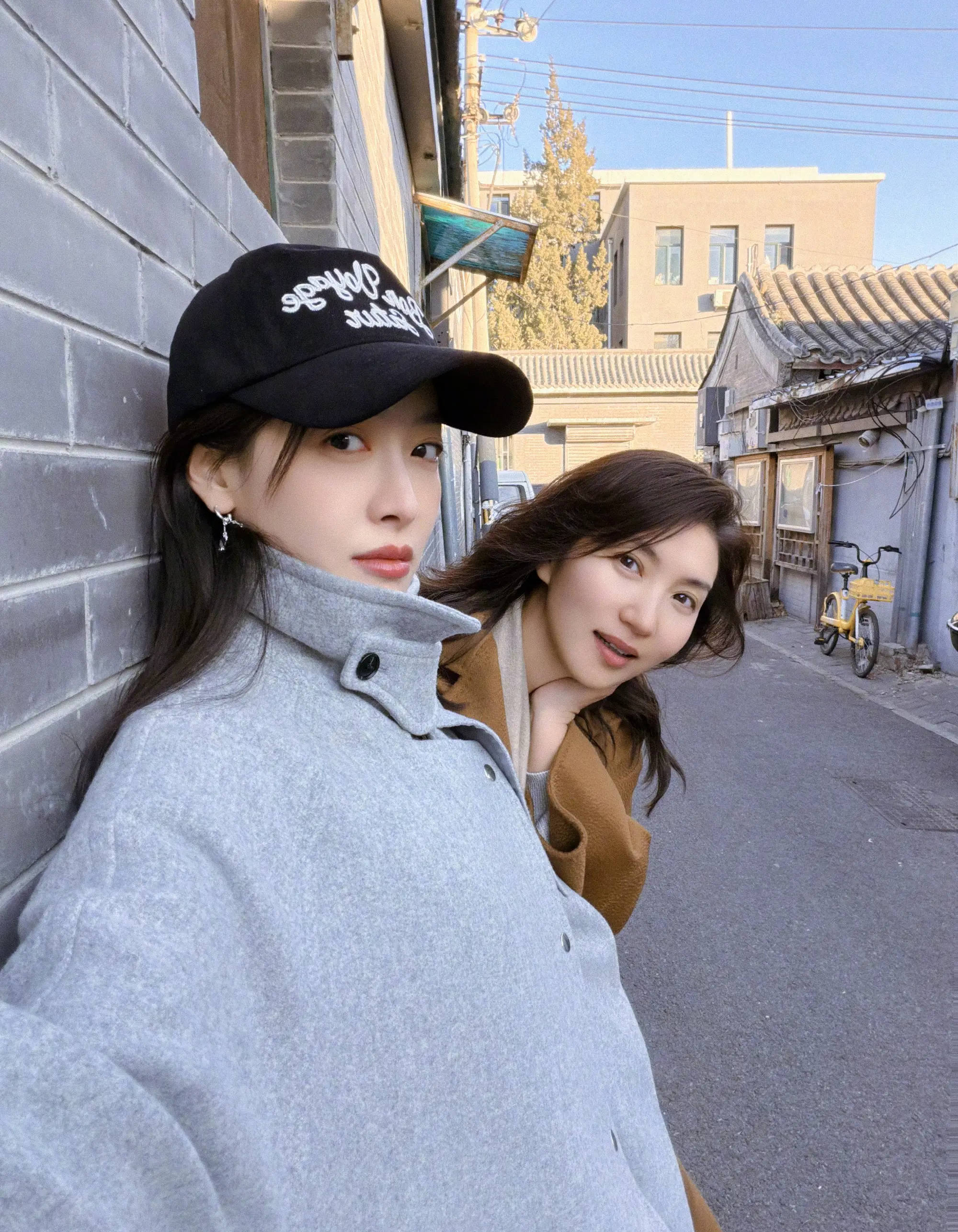 宋茜与陈好在胡同里拍合照。