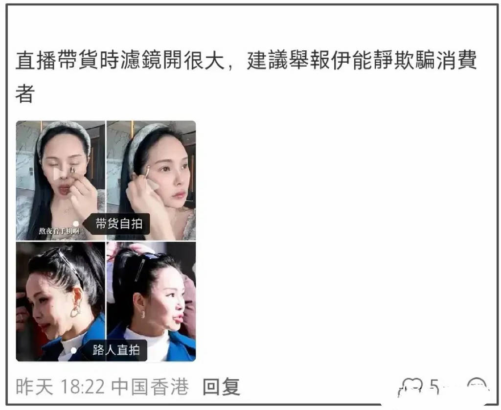 即便如此,伊能静还是对着镜头热情的营业。她的苹果肌很僵硬、脸上的细微动作不明显,看起来不太自然,是一种皮笑肉不笑的感觉。