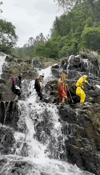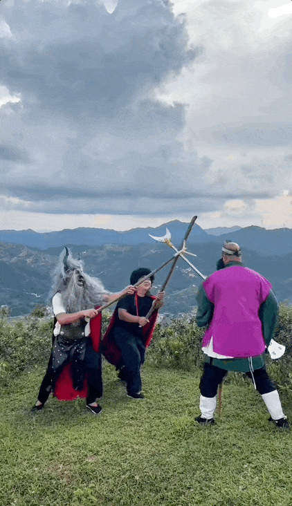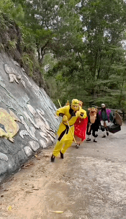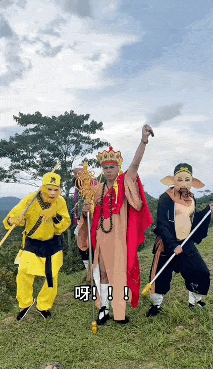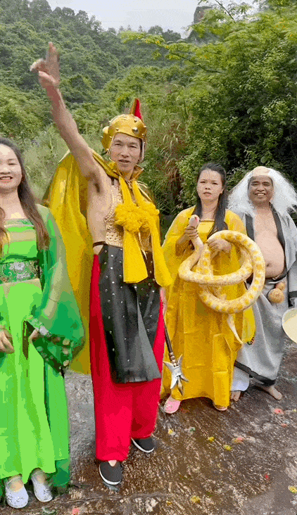 沙僧则是挑着20斤重的木箱,里面是真装了干粮和充电宝,成为“最强爬山选手”。
