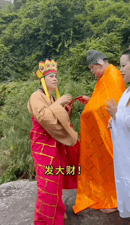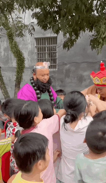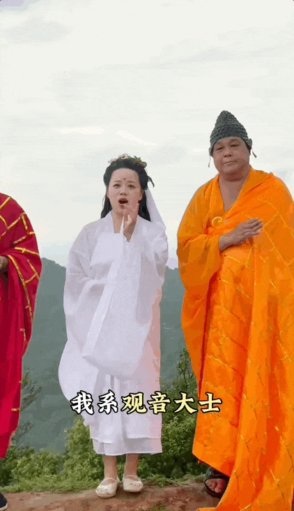 全村出动,村花当女儿国国王,八旬阿婆扮佛祖,农妇当宫女,小孩演哪吒、大叔扮国王。