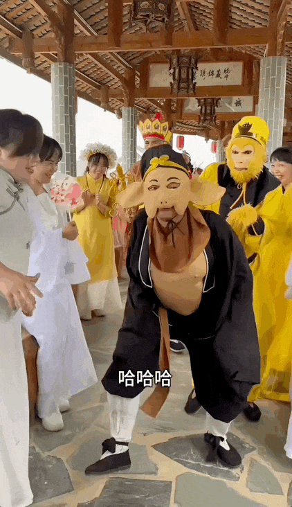 悟空挥着塑料版金箍棒“打妖”,八戒则被“丝”缠住疯狂爆笑。