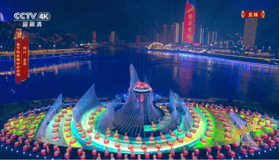 其实,这里已经不是第一次亮相总台晚会镜头。作为网红打卡地、宜宾标志性城市美景之一,在夜光中远眺,三江口形似一条龙卧于江面,吞吐三江。本次春晚,更是精心设计光影和舞台,使之与整个城市夜景融为一体,以城为景,山水联动。