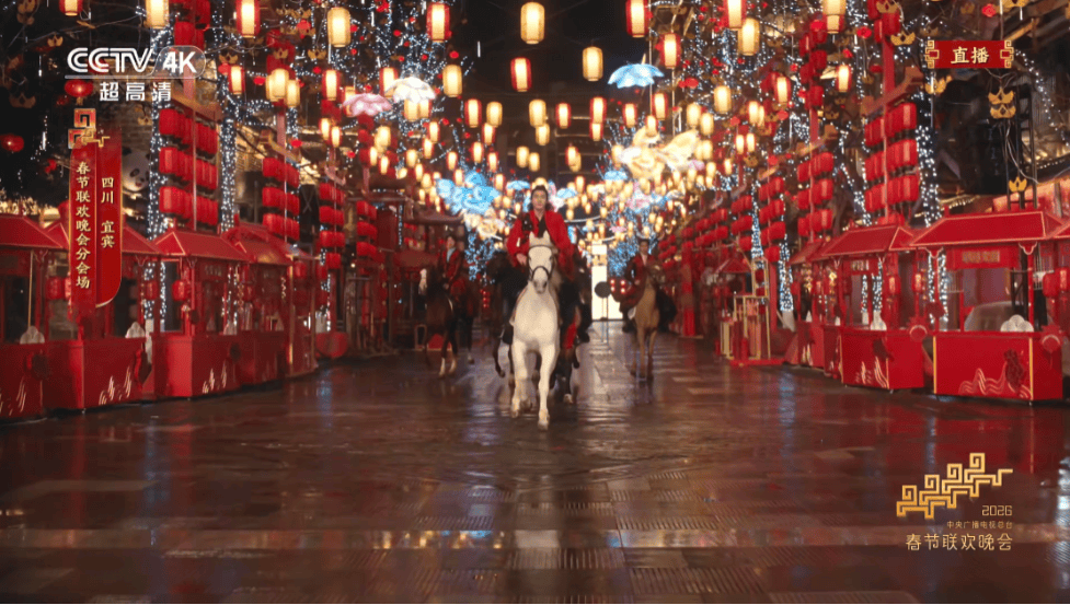 2026年是农历马年,宜宾分会场的节目洋溢着浓浓的马元素:奔腾的马跑过李庄古镇、蜀南竹海、长江大桥、501白酒文化圣地、万象宜宾天地等城市地标,最后跃进“请春酒”现场。