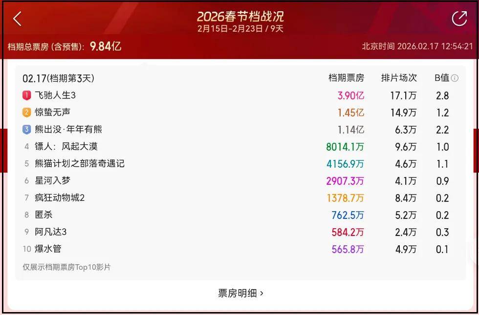 只是必须要承认,《熊出没》的票房表现,和电影本身质量关系不大,每一年都堪称受其他电影口碑影响最大的电影,还是来看看2026年春节档五部真人片的首波口碑吧!