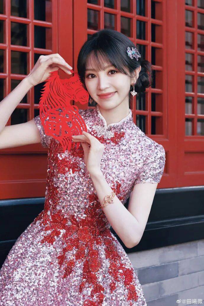 首登春晚的田曦薇身着新中式亮片礼服,黑色长发盘起侧扎成丸子头,与她的大眼娃娃脸适配度满分,清透的底妆搭配自然的浅眉,一抹橘红色唇妆与红色窗花呼应,甜妹气质与新春喜庆感完美融合!