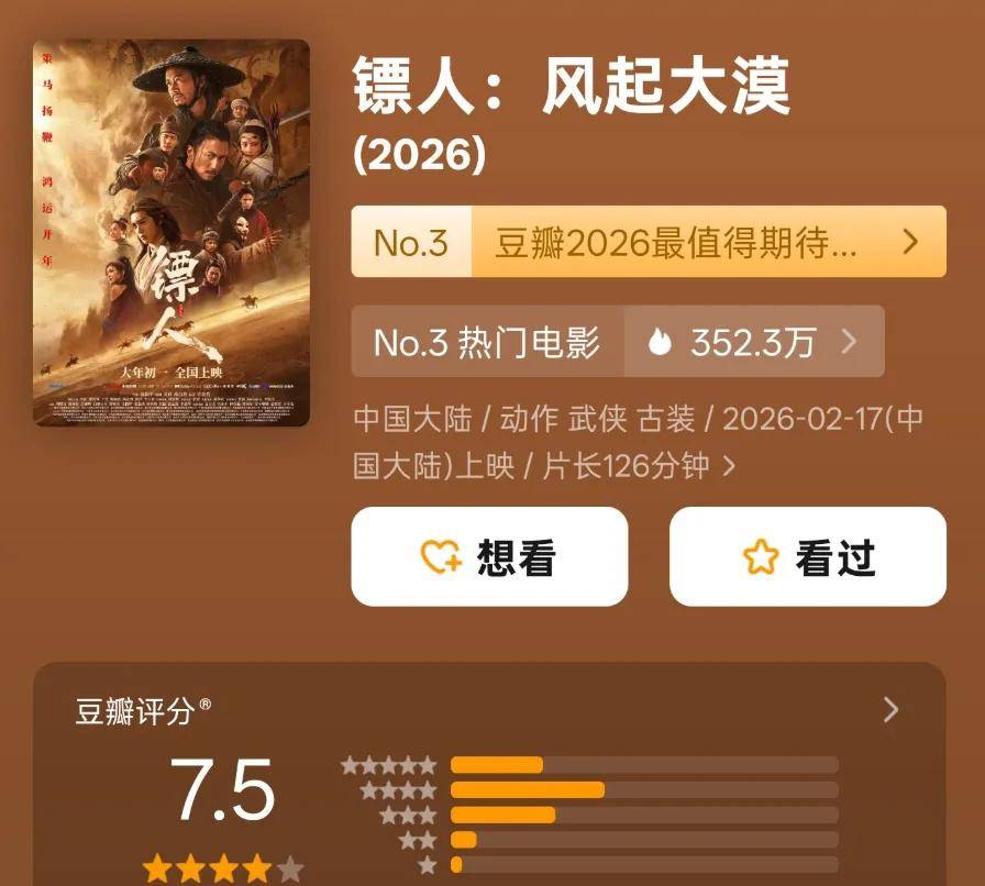 目前春节档已有四部真人片开启了评分:《飞驰人生3》拿下7.6分,暂列第一;《镖人:风起大漠》评分破7.5,口碑逆袭;《星河入梦》评分7.0,表现不错;《惊蛰无声》只有6.3分,默默垫了底。