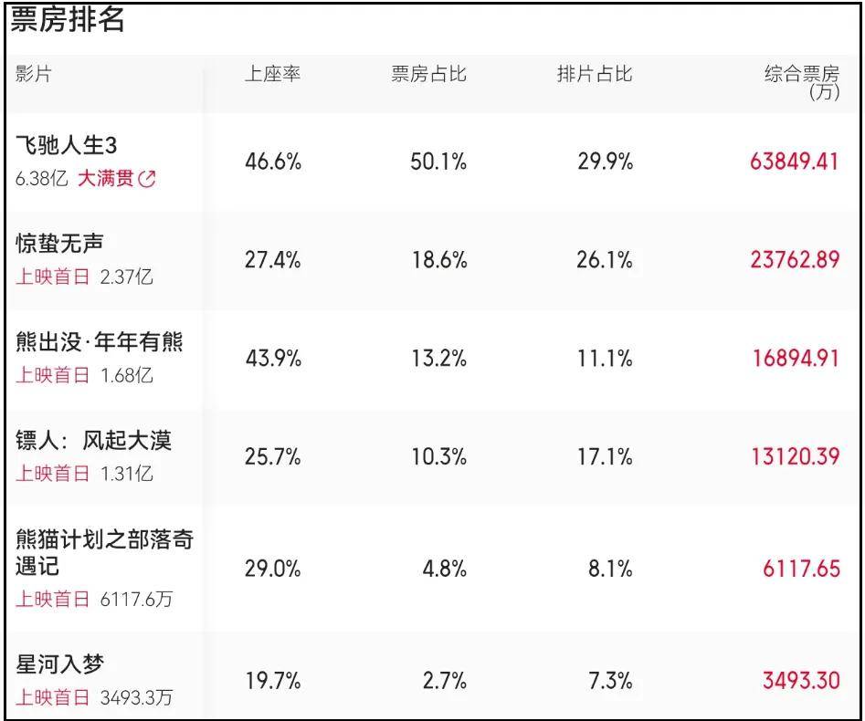 没倒挂还破了亿的《熊出没》稳居票房前三,上座率比第二名《惊蛰无声》还要高,都有网友喊话《惊蛰无声》“吐”排片了。