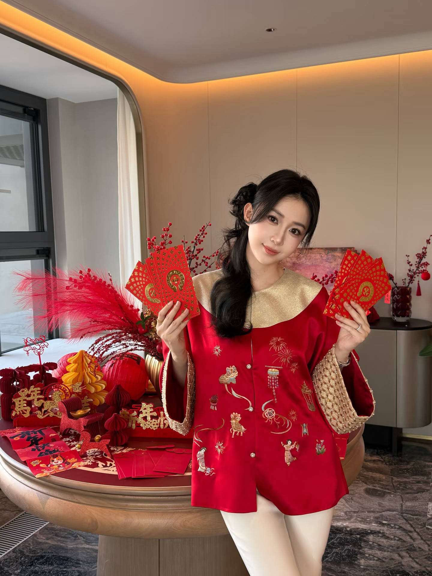 而宣云也穿了一件特别喜庆的衣服,红色的新中式上衣,利用了撞色设计,形成一种大领口的效果。