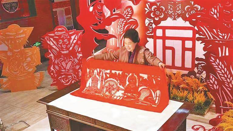 倪秀梅在总台春晚哈尔滨分会场展示方正剪纸作品。
