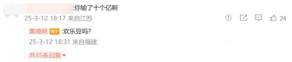 有网友在评论区留言“你输了十个亿啊”,黄晓明火速回复:“欢乐豆吗?”