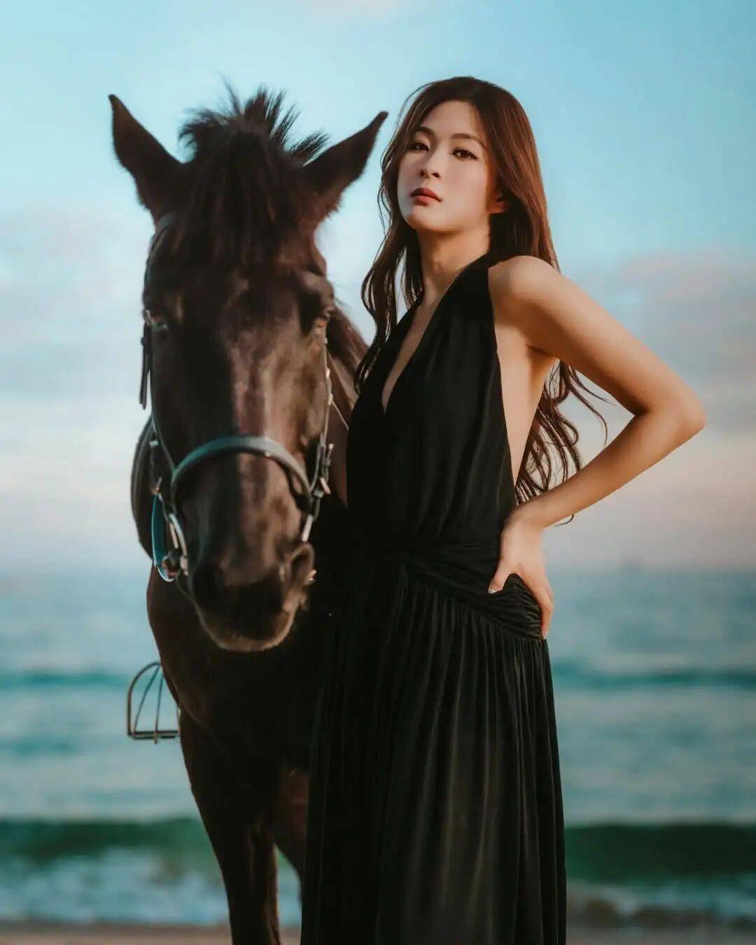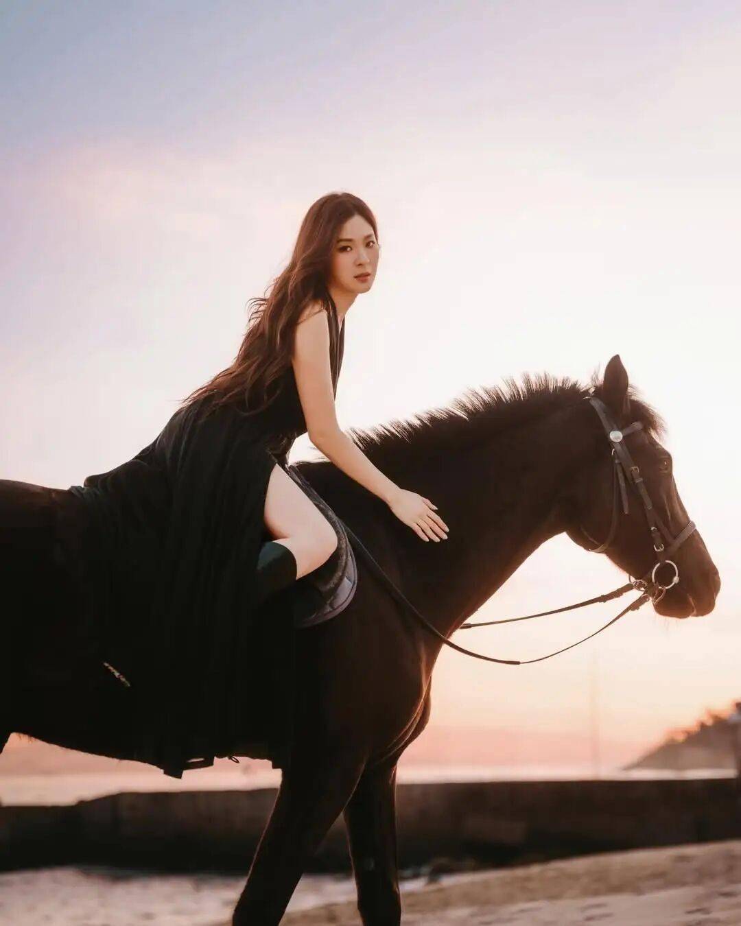 今年是马年,艺人陈懿德(德德)昨日在社交网晒出与骏马的合照,可见德德身穿黑色低胸高衩长裙搭长靴,大晒长腿与好身材,她在骏马上摆出各种有型的姿势,既帅气又充满女人味,十分吸睛。