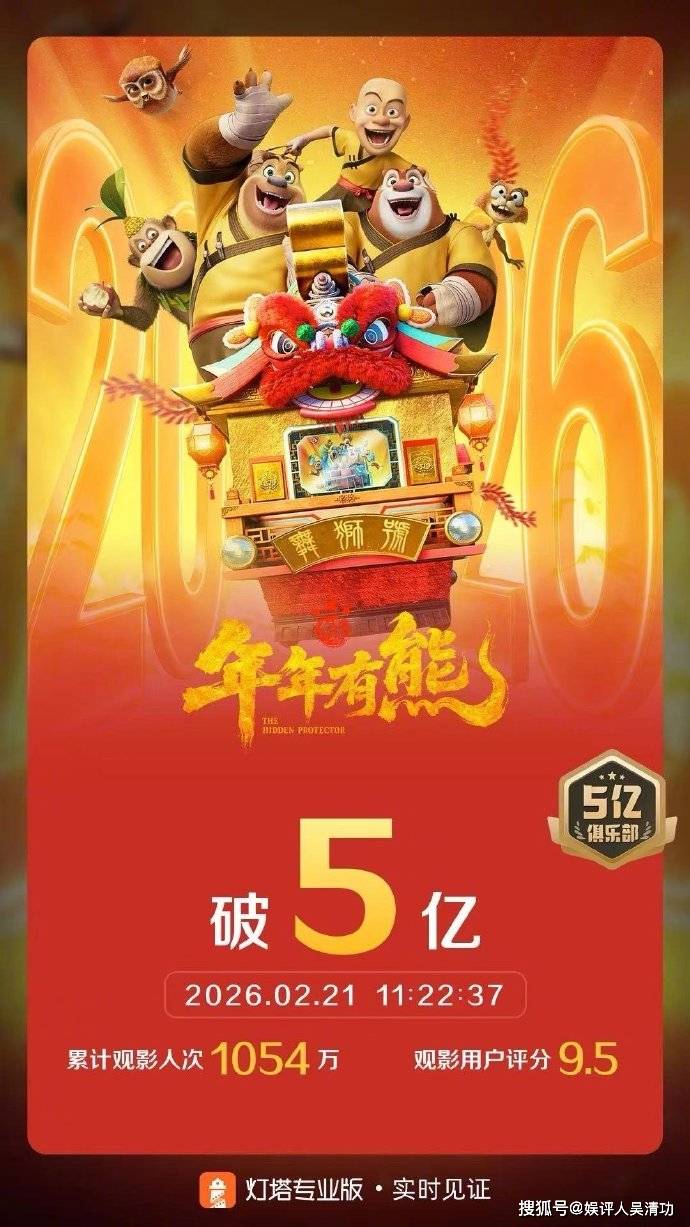 《熊出没》系列电影每年都能在竞争激烈的春节档斩获很多票房,确实堪称“春节档最稳的钉子户”。今年的《熊出没·年年有熊》作为系列第12部电影,不仅延续了这份稳健,更在口碑上实现了突破。截止到2026年2月21日晚上9点,《熊出没·年年有熊》票房高达5.56亿,预估最终票房高达9.77亿。
