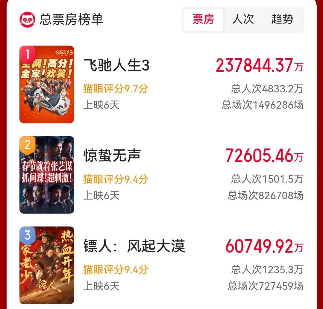 左边是《飞驰人生》续集占据ip基本盘,右边是《惊蛰无声》的“春节就看张艺谋”,《镖人》在这个春节档也算是“夹缝生存”了。