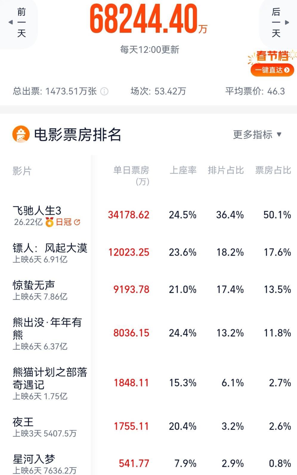 初一到初六,《星河入梦》的排片占比从7.3%跌到了2.9%,上座率从18.6%跌到了7.9%,只有《飞驰人生3》《熊出没·年年有熊》《镖人》的约三分之一,远远垫底。