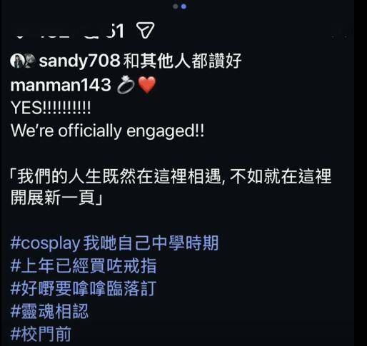 陈耀淙女友Manman也分享喜悦,晒出求婚钻戒甜蜜官宣:“YES!!!!!!!!!! We're officially engaged!!”她更分享二人的爱情故事:我们的人生既然在这里相遇,不如就在这里展开新一页。
