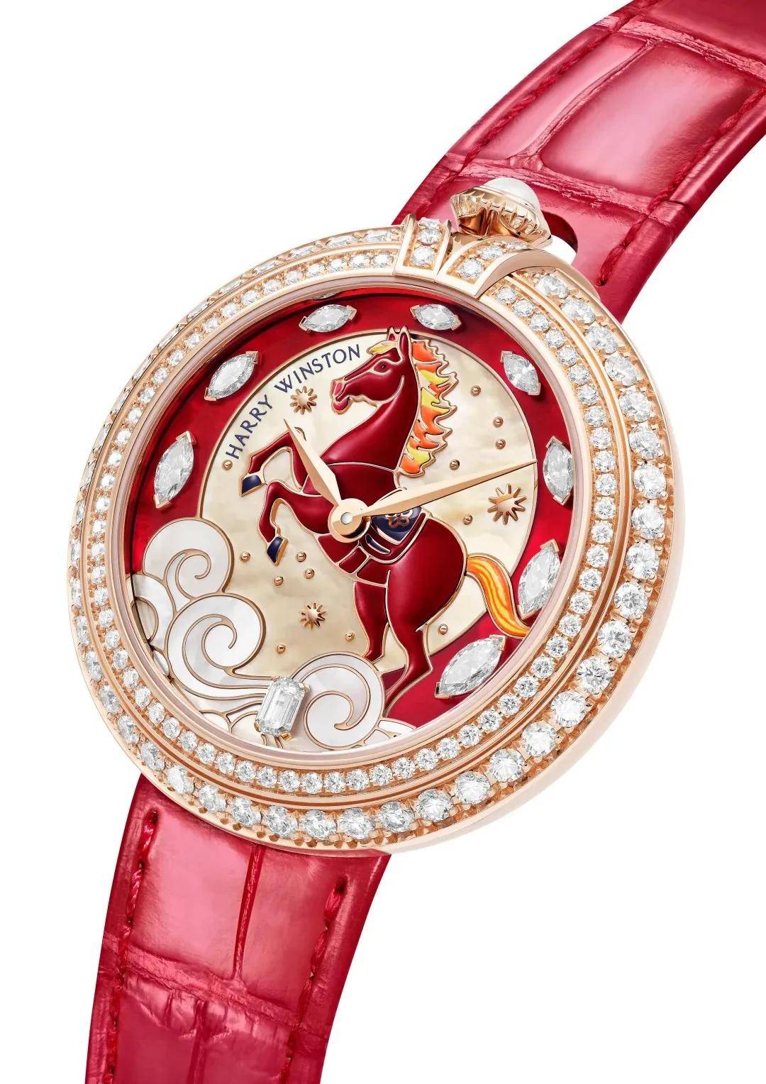 HW的Moments系列推出了一款Blingbling的玫瑰金马年腕表。不同于硬朗风格,它采用亮红色漆面描绘骏马,色彩明艳喜庆,彰显出马所象征的独立与冒险精神。