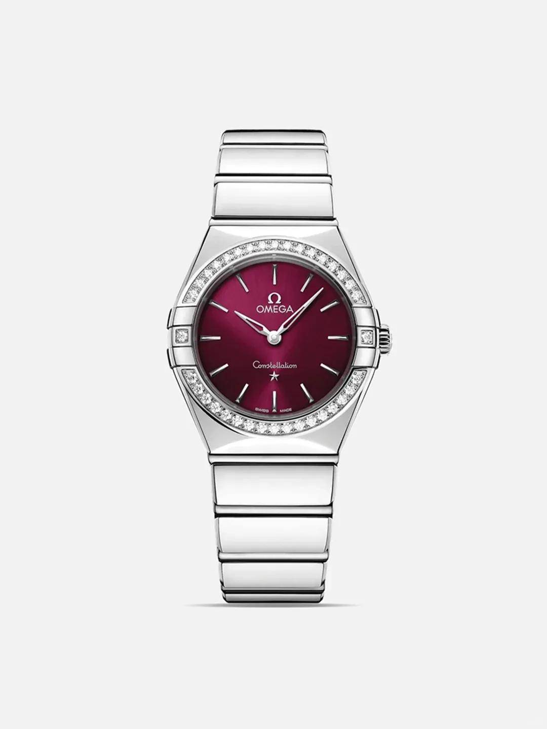 这款表采用了精致的全抛光设计,深邃的勃艮第红色盘面极具高级感,搭配闪耀的钻石表圈,在腕间划出一道华丽的弧线。