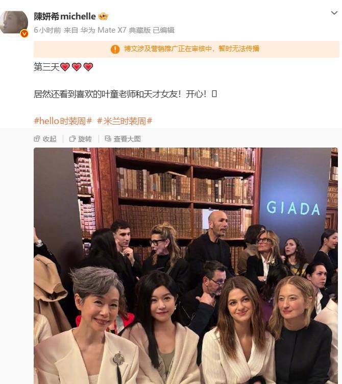 活动后,陈妍希通过微博分享与叶童的合照,配文直白写道:“第三天居然还看到喜欢的叶童老师和天才女友!开心!”毫不掩饰对前辈的崇拜之情。这一幕被网友幽默调侃为“看秀顺便追星成功”。而叶童与胡可的互动同样自然流畅,全程热聊毫无隔阂。