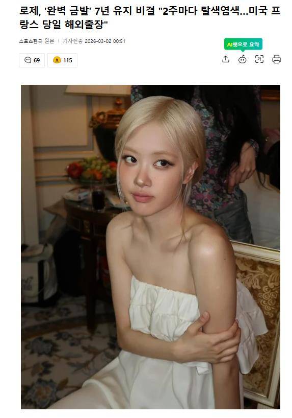 车院长将Rosé的金发视为自己的“代表作”,并透露了一个关键数字:7年。在这长达七年的时间里,Rosé几乎从未间断地维持着金发造型,而秘诀就是惊人的 “每两周漂染一次”。
