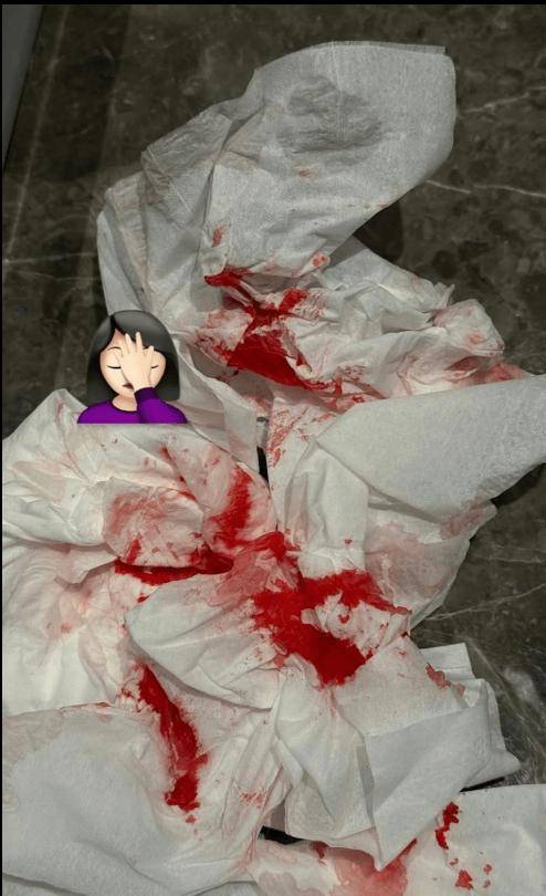 黄婉恩在社交网晒出多张染血纸巾,写道:“泡温泉不要起身太急!会晕的!晕了几分钟,醒来完全不知道自己在哪里,真的好恐怖,头撞到石头,幸好没事啦!”