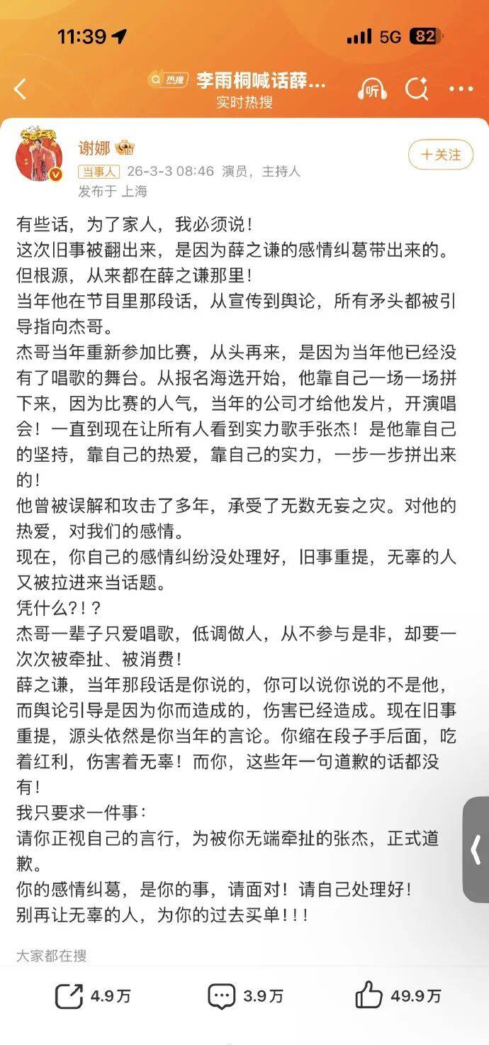 2026年3月初李雨桐对薛之谦的混乱爆料中,她点名了胡彦斌、张杰等十余名艺人,但只有谢娜公开回应,还引发张杰前女友的骂战。