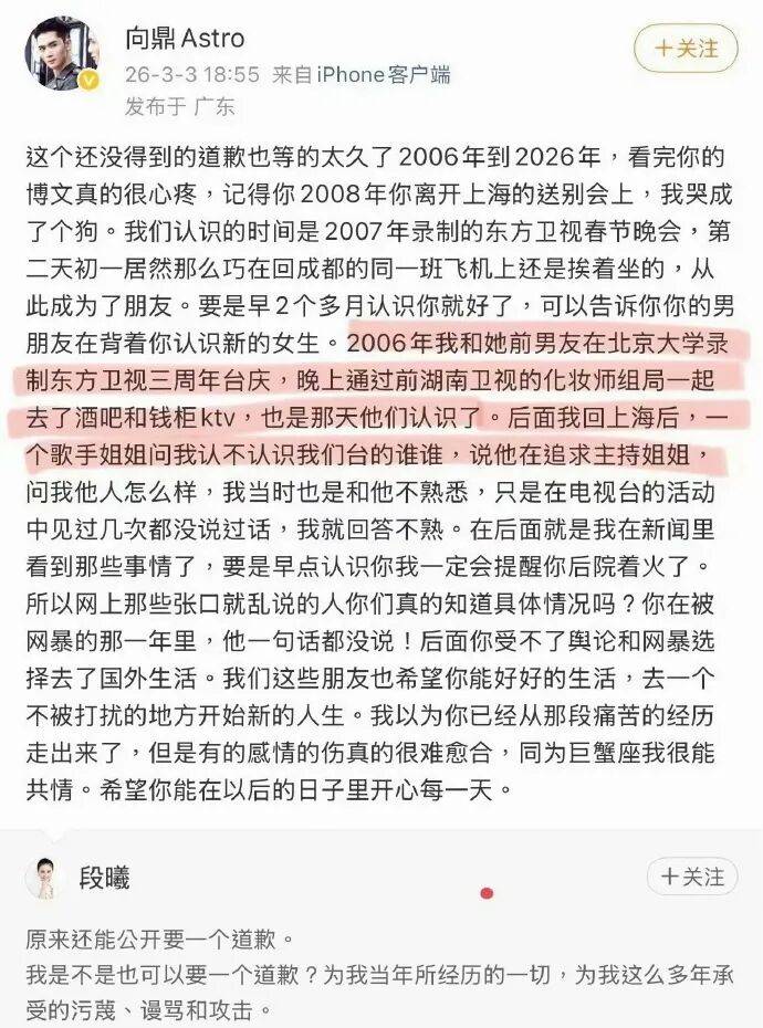 接着,《加油好男儿》选手向鼎发文称2006年目击张杰“背地段曦结识新女生”,并指责张杰对前女友段曦被网暴“一言不发”。