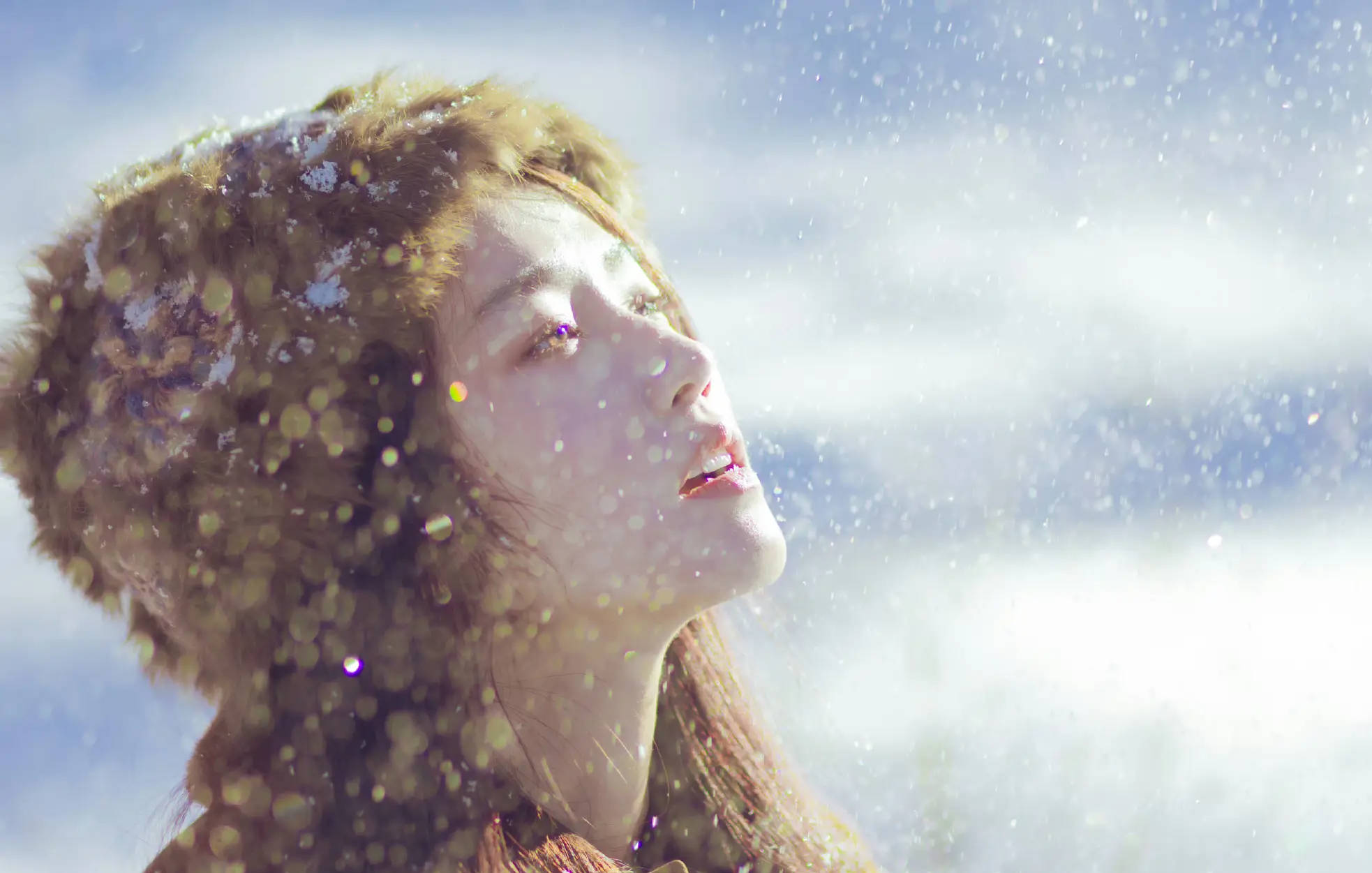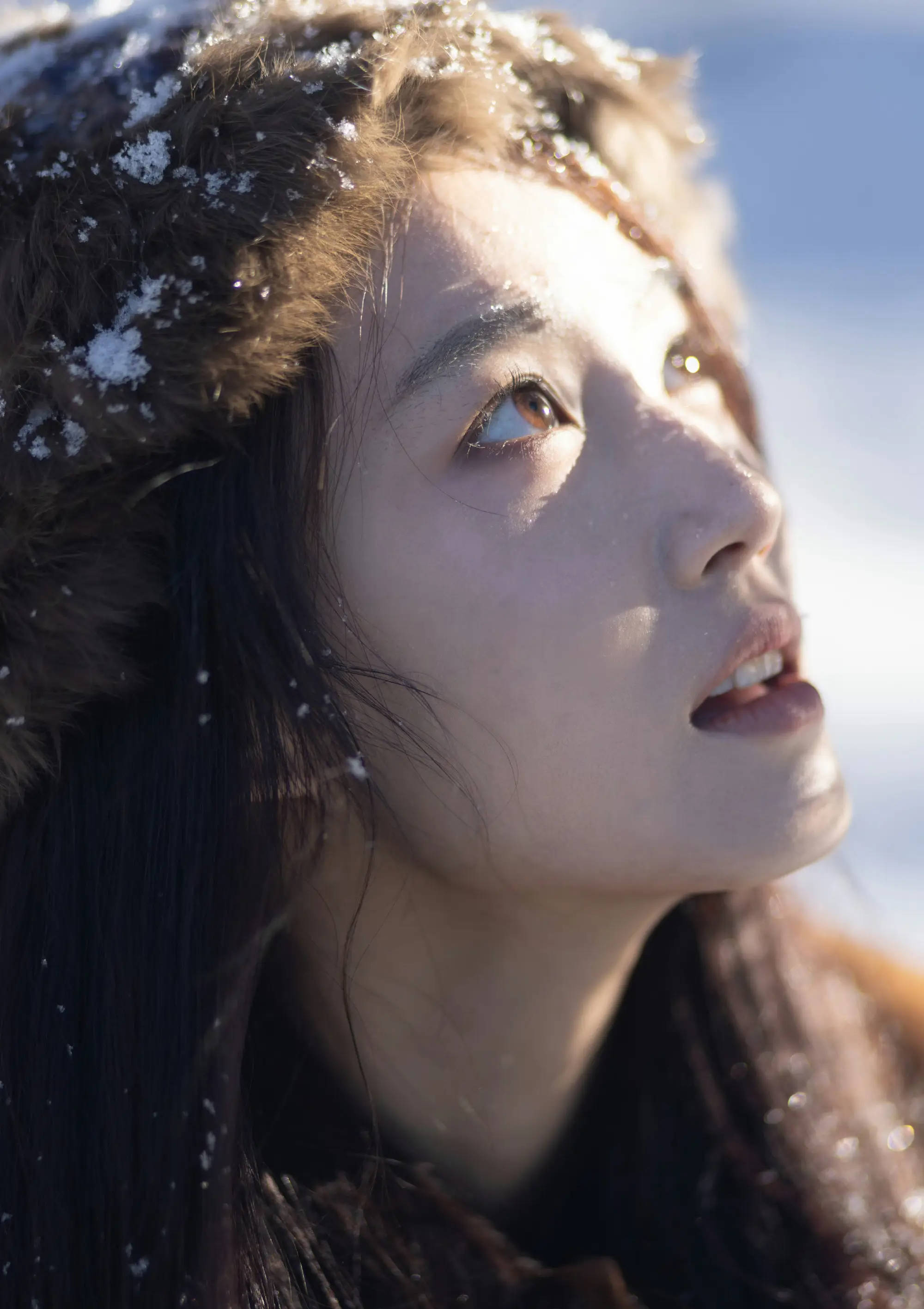 卢昱晓抬首望雪,神情澄澈。