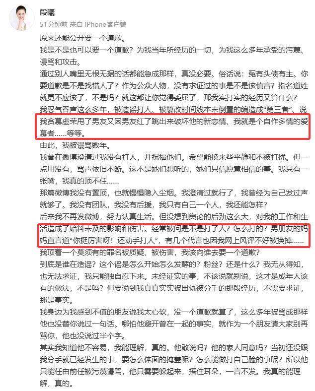 段曦先是对自己这么多年所遭受的网暴、造谣做出了澄清。