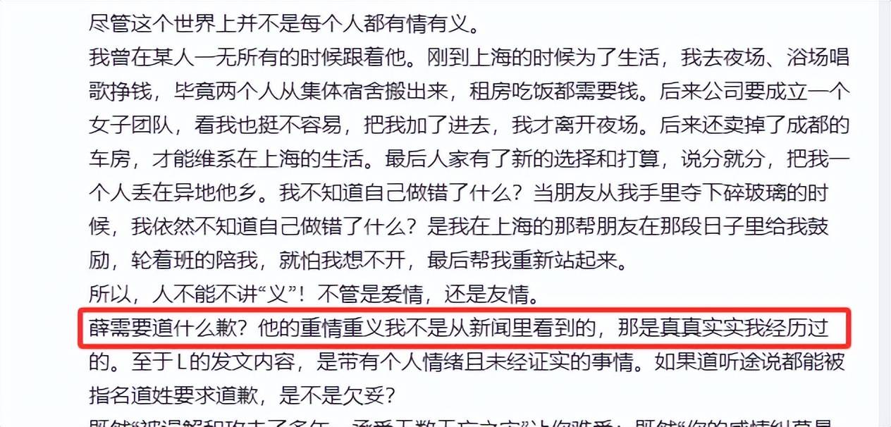 段曦最后还不忘喊话薛之谦:“不用道歉”,并称他的义气是自己真实经历过的,所以薛之谦不需要道歉。