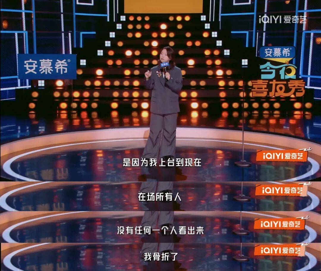 最绝的是结尾,嘻哈讲完一整段突然说:“我上台到现在,在场所有人没有任何一个人看出来我骨折了。”