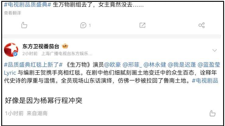 杨幂早早就确定不出席电视剧品质盛典,给出的说法是行程冲突。
