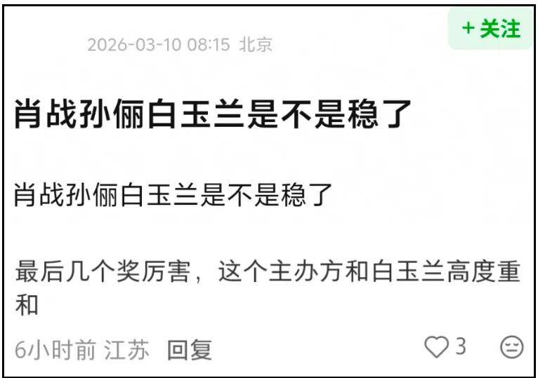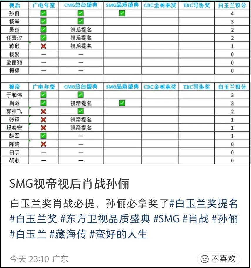 虽说白玉兰奖前哨战的说法是近两年才出现的,但在SMG主办的颁奖礼上,《生万物》全员拿奖独缺杨幂一事,也是越看越觉得微妙。
