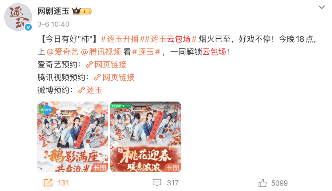 因此,从开播到现在,能看到这部剧在双平台上所拿到的升级待遇,例如99999份一日追剧卡、免费云包场等,意图都是让《逐玉》辐射到更多路人。