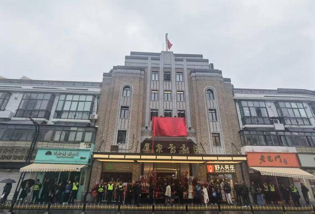 中午,记者提前探访群众影剧院,发现不少市民游客专程赶来,打卡拍照。“好不容易抢到了首演的票,我特意从北京飞过来,给郭老师捧场。”“纲丝”刘小姐告诉记者,她得知一众相声演员下午要剪彩,就早早赶到四川北路1552号现场。1点18分,郭德纲、于谦身着休闲装,准时出现在剧院门口,为上海德云社揭牌。隔着马路围观的数百市民游客纷纷掏出手机拍摄记录这一刻,还有不少人干脆开起了直播。