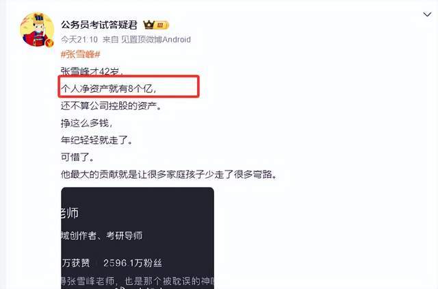 据某权威数据称,张雪峰生前共关联11家企业,其中9家为存续状态,包括苏州峰学蔚来教育科技有限公司、苏州研途教育科技有限公司等。不过这还并不是重点,重点是他对外投资的企业超过百余家,由此就可估算其身家过亿。