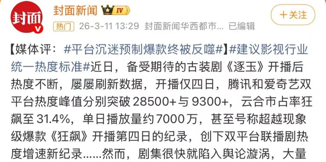 不只是《逐玉》,最近两三年“预制爆剧”成为一种趋势性现象。陈晓春提到,平台过于追求短期表面流量的行为,造出了“塔西佗陷阱”,让观众对剧集热度和数据有了信任危机。