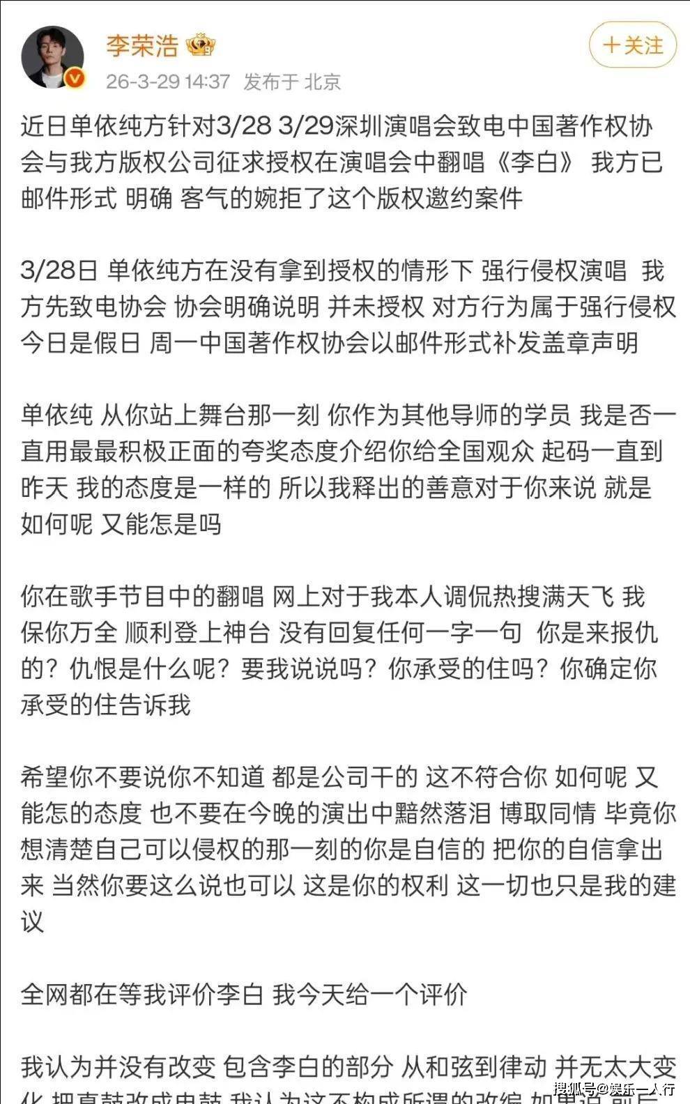3月27日收到明确拒绝的邮件,3月28日照样登上深圳的舞台开唱。 这不是什么“工作疏忽”能解释的,在李荣浩看来,这就是一次明目张胆的“强行侵权”。他晒出了中国音乐著作权协会(音著协)的确认邮件,白纸黑字写着“未就该作品发放任何授权”。一场普通的商业演唱会翻唱,硬生生演变成了全网围观的法律纠纷和情感对决,李荣浩连发两条博文,把证据拍在台面上,四连质问单依纯“用什么立场、什么权利、什么角度、什么心态演唱?”他的愤怒几乎溢出屏幕,因为这件事触碰的远不止法律红线。