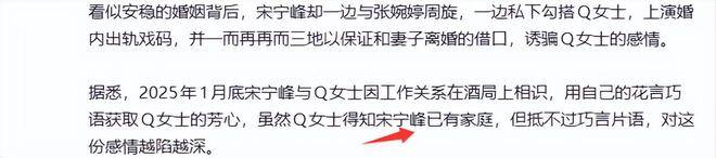 3月31日下午,某狗仔突然爆料称宋宁峰婚内出轨,这一消息迅速登上了微博热搜榜,阅读量瞬间破亿,评论区几乎炸开了锅。网友们震惊不已,难以相信那个看起来默默隐忍、老实无害的宋宁峰,居然做出了出轨这种令人无法接受的事。根据爆料,宋宁峰在2025年1月的一次酒局中结识了Q女士,两人一见钟情,很快便陷入了婚外情的漩涡。