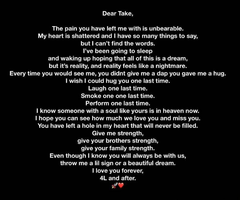 当时Offset还发了长文缅怀Take Off。