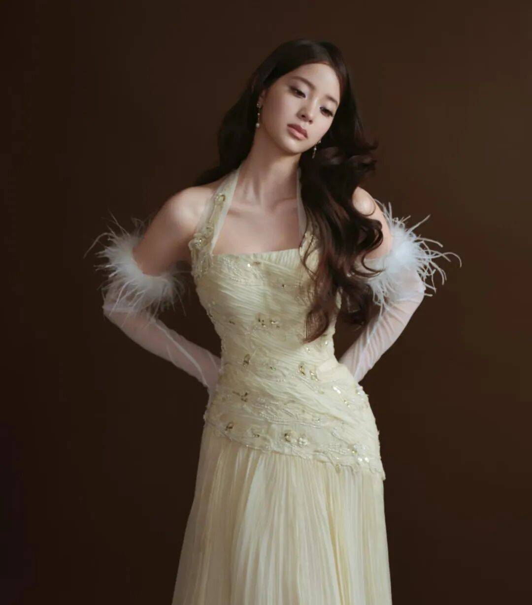 这一套太好看了,黄色的古董风浪漫礼裙,搭配羽毛视白色蕾丝手套,好有经济上行期的复古美呀,好像是以前的好莱坞女明星一样,尤其喜欢搭配的这一头洋娃娃卷发哦,超级浪漫修饰脸型,感觉有点借鉴很火的SANA卷。