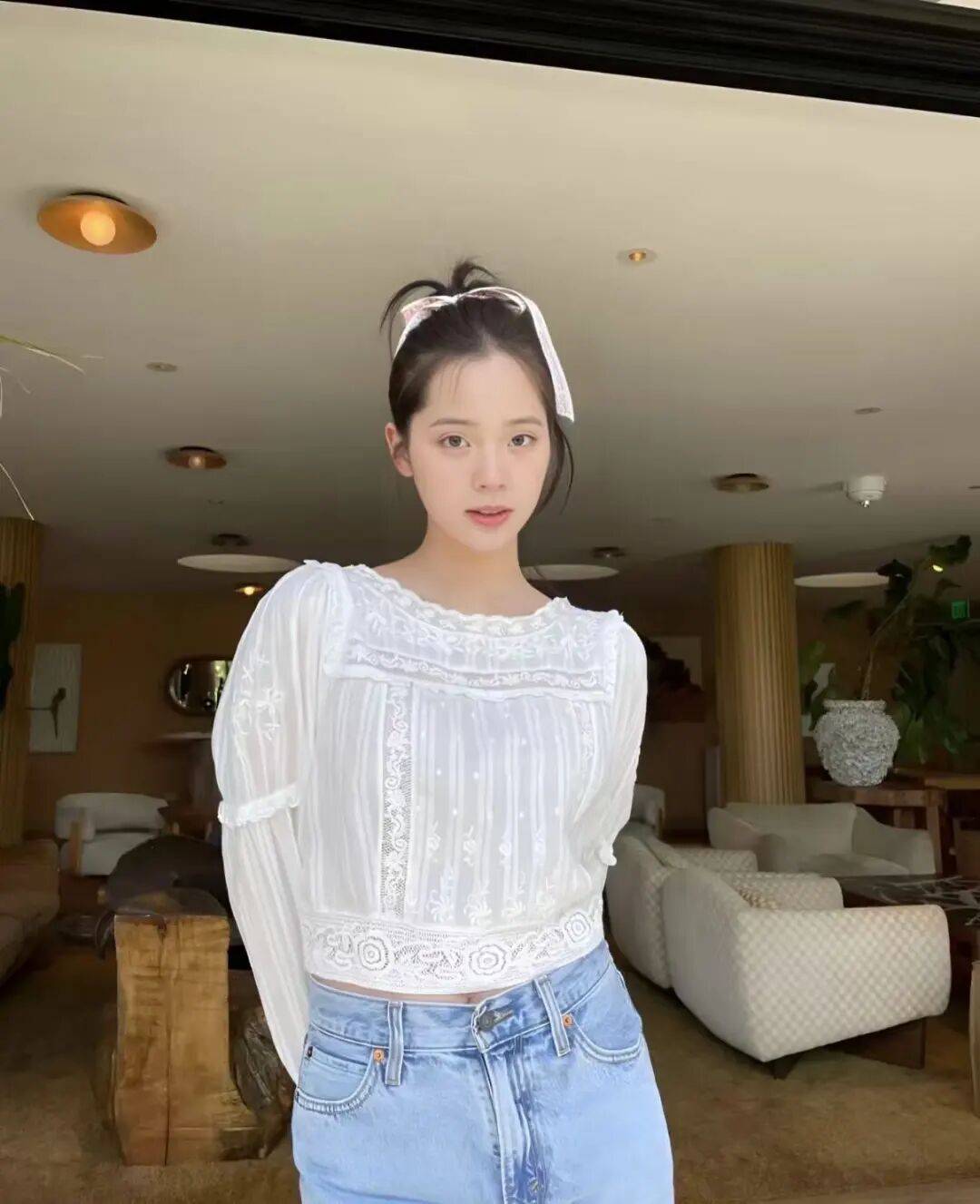 素素的,好漂亮,好白开水的一套,法式蕾丝白衬衫+水蓝色牛仔直筒裤,这种穿搭真的就适合这种淡淡的伪素颜妆容,衬托出好气色就好啦!我觉得头上的粉色蝴蝶结丝带装点得刚刚好,真的是无忧无虑的少女气息。