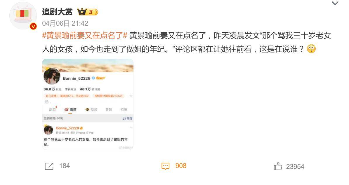 据网友4月6日晚间爆料,4月5日凌晨,黄景瑜前妻王雨馨在社交媒体上发布了一句意味深长的话:那个骂我三十岁老女人的女孩,如今也走到了做姐的年纪。这看似随意的一句话,却像投入平静湖面的石子,瞬间激起网友们的好奇心。评论区里,无数人劝她往前看,却压不住大家的八卦本能——究竟她在暗指谁?