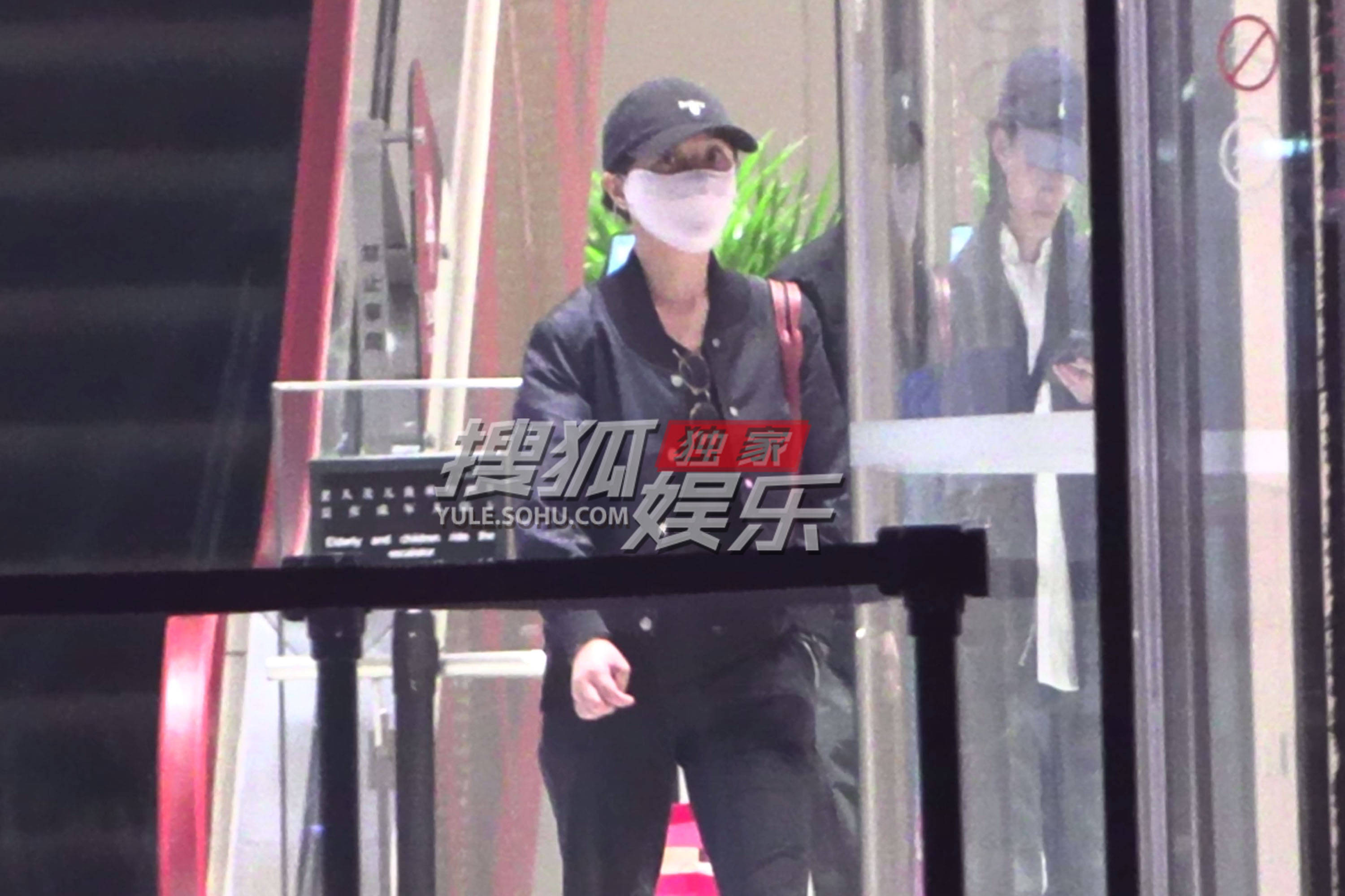 她几乎素颜状态,黑色短夹克搭配高腰裤,整身黑色非常简约。