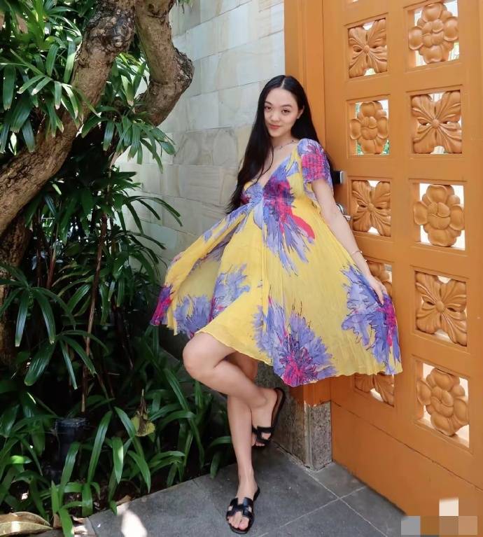 李连杰女儿穿着花裙子。