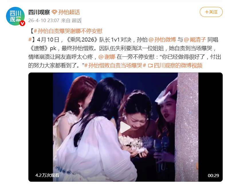 据4月10日晚间报道,《乘风2026》的队长1v1对决现场,上演了一幕比舞台表演更牵动人心的“情感风暴”。孙怡与阚清子同台竞技,共唱一首《遗憾》,最终孙怡以423票惜败于阚清子的468票。然而,让全场和屏幕前观众瞬间破防的,并非票数差距,而是结果公布后孙怡那场彻底的情绪崩溃。